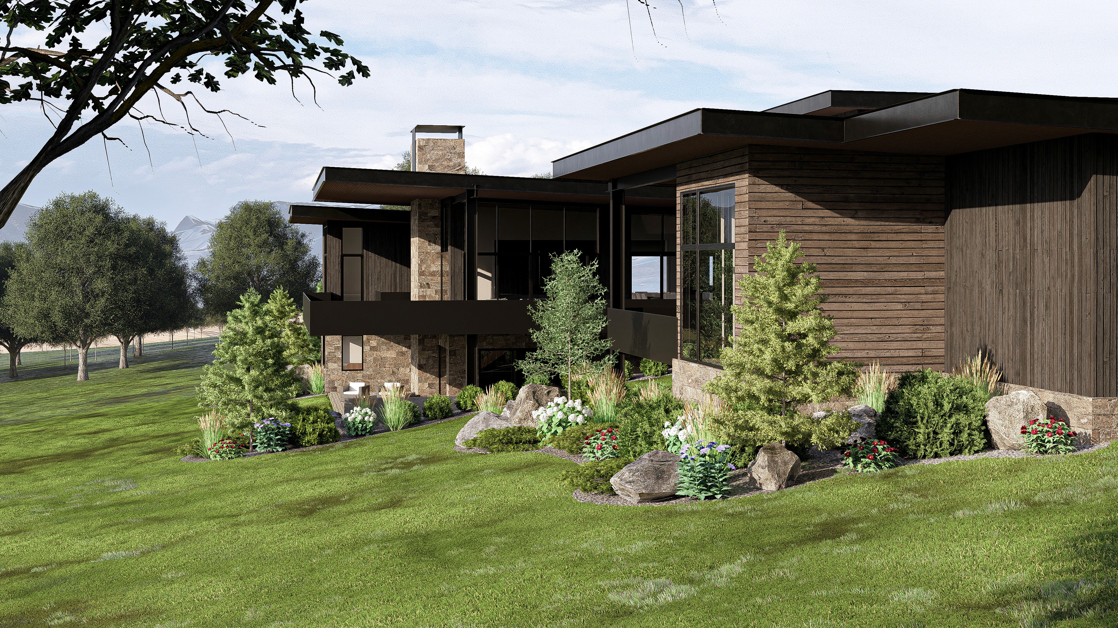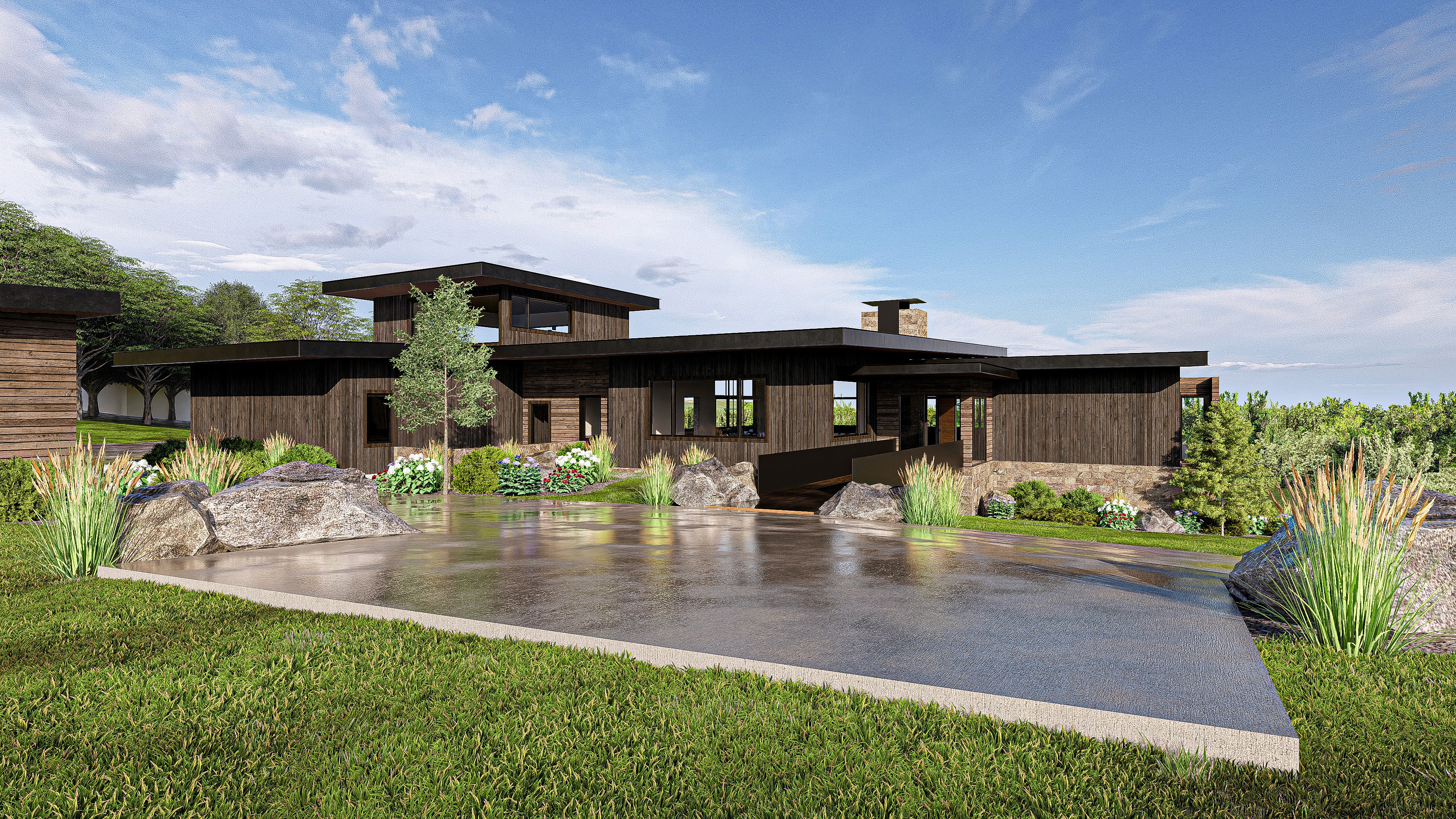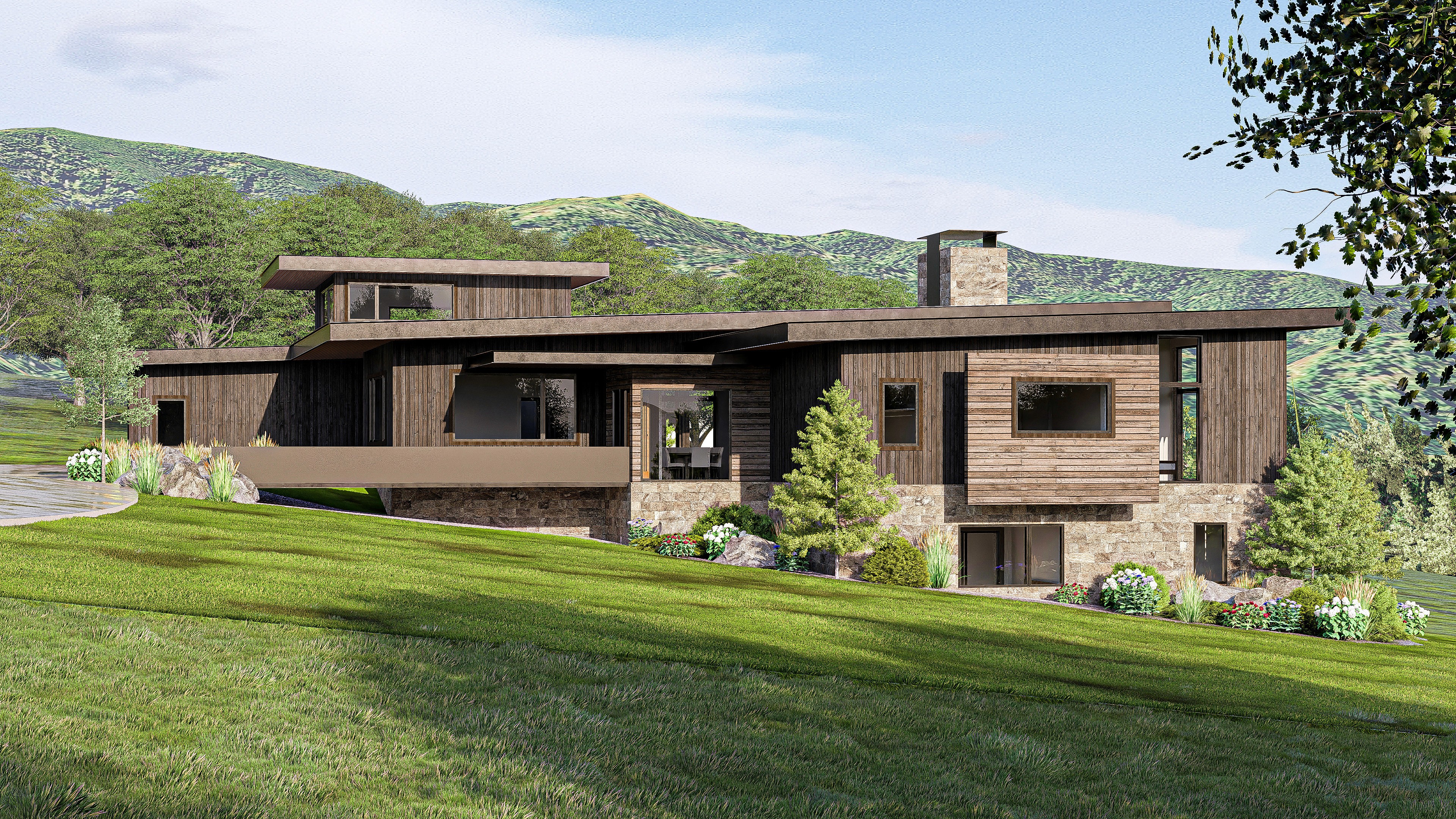 Perched on hilly terrain with panoramic mountain views, the 6,000-square-foot Eagle Rock Residence is thoughtfully integrated into its natural landscape. A bridge approach preserves the site’s contours, while flat modern forms nestle the home into the hillside, creating a seamless connection between architecture and nature.